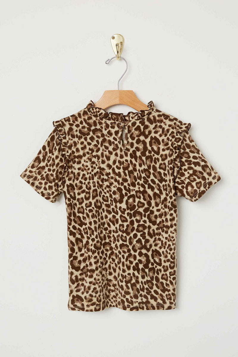 Leopard print, ruffle neckline and trim sleeves, back button keyhole closure