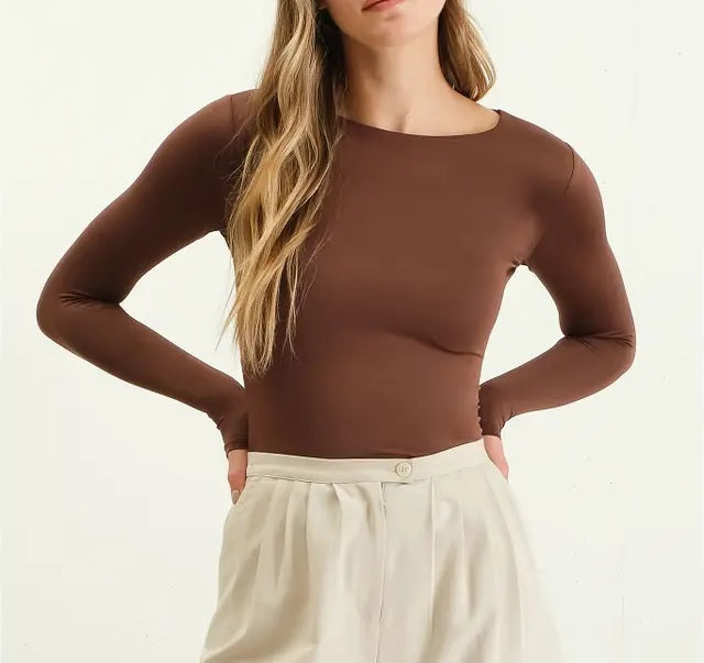 Round neck long sleeve fitted top. Extremely soft and perfect on it's own or layered with a sweater or blazer.